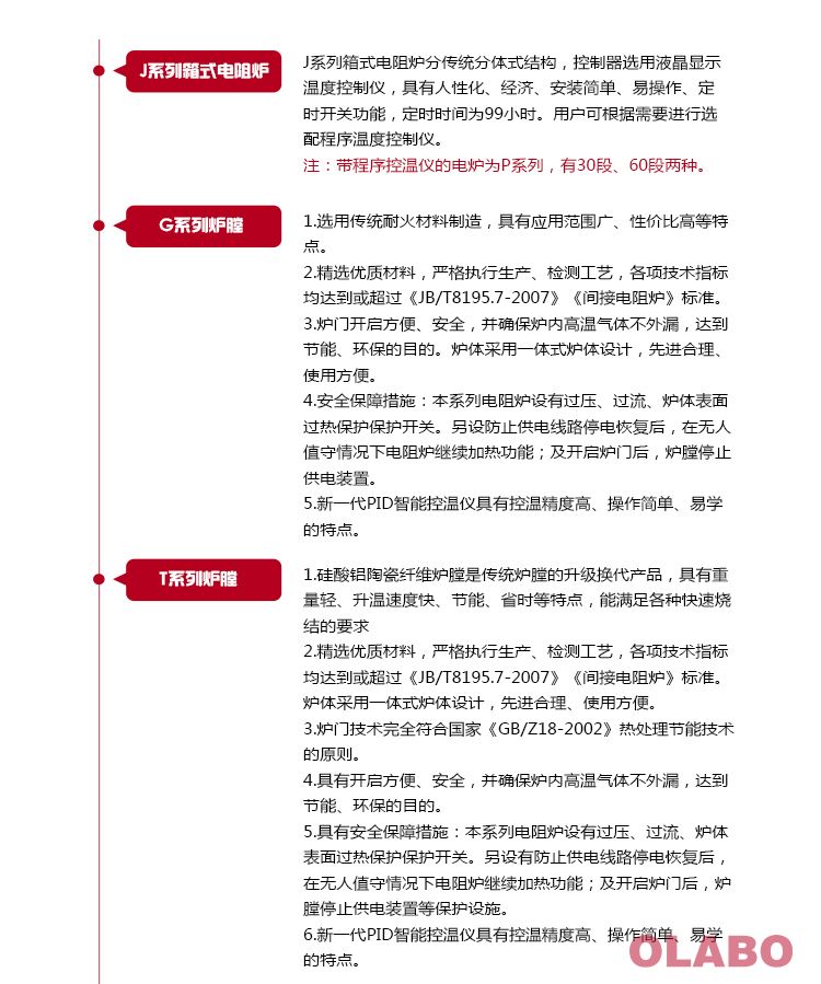 3、具有安全保障措施:本系列電阻爐設有過壓、過流、爐體表面過熱保護保護開關。另設有防止供電線路停電恢復后,在無人值守情況下電阻爐繼續加熱功能;及開啟爐門后,爐膛停止供電裝置等保護設施。